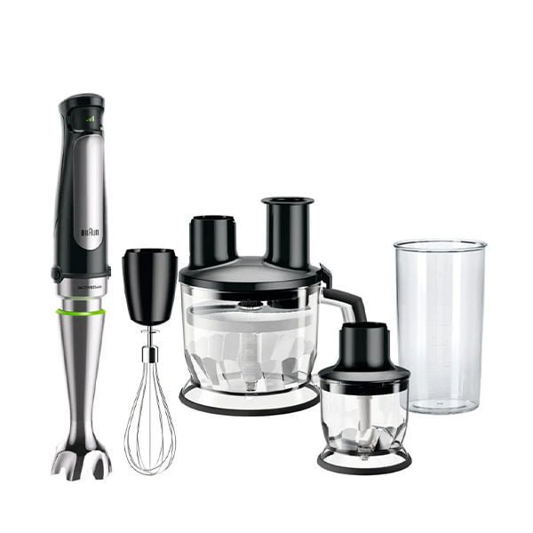 براون / خلاط يدوي / فضي و أسود / 1000 وات / الوعاء بسعة 600 مل / الكبة بسعة 350 مل / محضر الطعام بسعة 1.5 لتر / تقنية Easy Smart Speed التي تمكنك من تغيير السرعة بدون إيقاف التشغيل / تقنية Splash Control لمنع الطرطشة / نظام Easy Click (إيزي كويك) لفصل الملحقات عن الجهاز بسهولة / فرم وتقطيع الطعام إلى شرائح وبشر وعجن / ملحق تقطيع الشرائح السميكة / ملحق تقطيع الشرائح الرفيعة / ملحق البشر الخشن / خطاف للعجن / سكينة فرم / مخفقة / ملحق للهرس